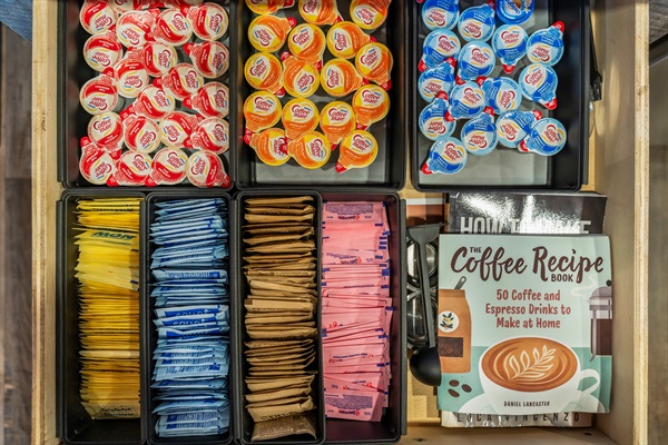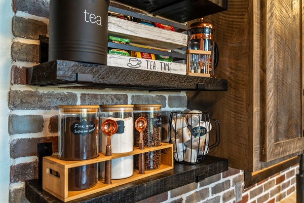"COFFEE & TEA BAR" with a variety of coffee cups, a drip and K-Cup coffee machine (equipped with cappuccino and espresso options), a coffee bean grinder, French press, and a selection of Starbucks K-Cups, Swiss hot chocolate K-Cups, teas, flavored